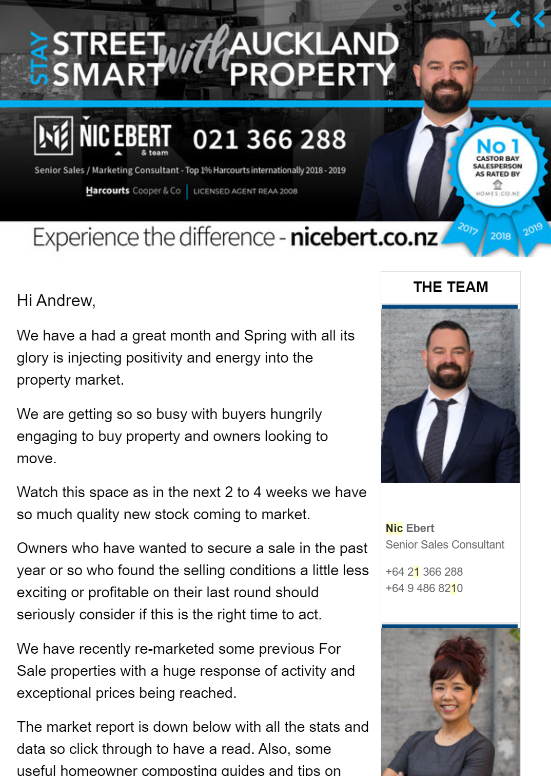 Real estate owners love being in the know. Especially when it comes to local house values. Send out a quick monthly email with a list of recent local sales in your area. Add a brief description of each property and use approximate sale values like 'sold in the mid $800,000's'. A photo of each property is an added bonus but not essential.